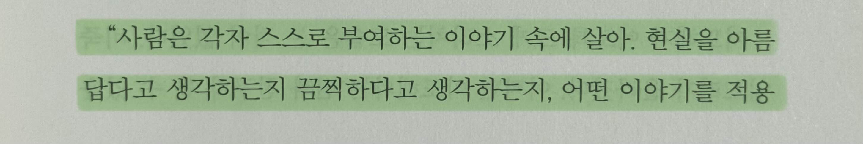 "사람은 각자 스스로 부여하는 이야기 속에 살아. 현실을 아름답다고 생각하는지 끔찍하다고 생각하는지, 어떤 이야기를 적용하느냐에 따라 그 사람의 삶은 180도 달라지는 거지."