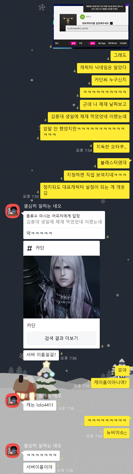 그래도 프로필 보는 법은 알려줘서 스샷 찍어서 카톡 보냈는데 뉴비이슈 발생; 이런 내가 로아 정지!? 당연하게 아직도 작업장이라는 게 무슨 행위인지도 모름ㅋㅋㅋㅋ 지네가 풀어서 알려줘야 하는 거 아니냐?