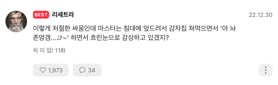 약간 고향의 맛도 나고 좋네요 댓글 반응 재밌어서 한 번씩 댓창 들여보는 작품 오랜만인 듯