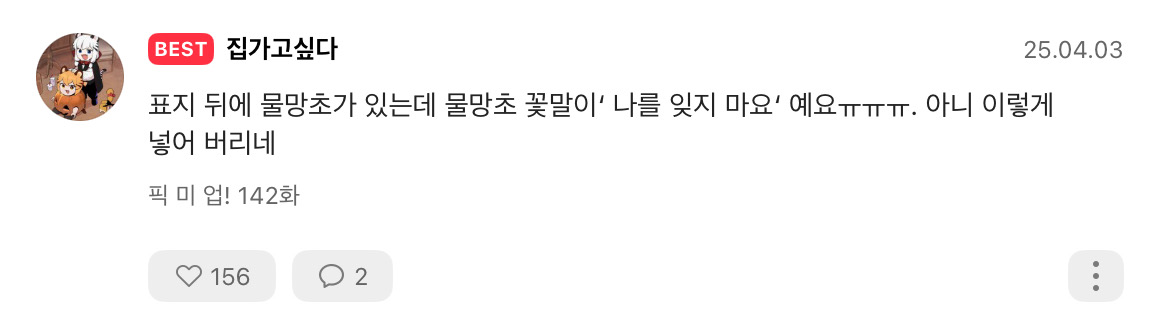 | [픽미업] 웹툰 151~170화 감상 타래 (1) | 2026.01.01 |