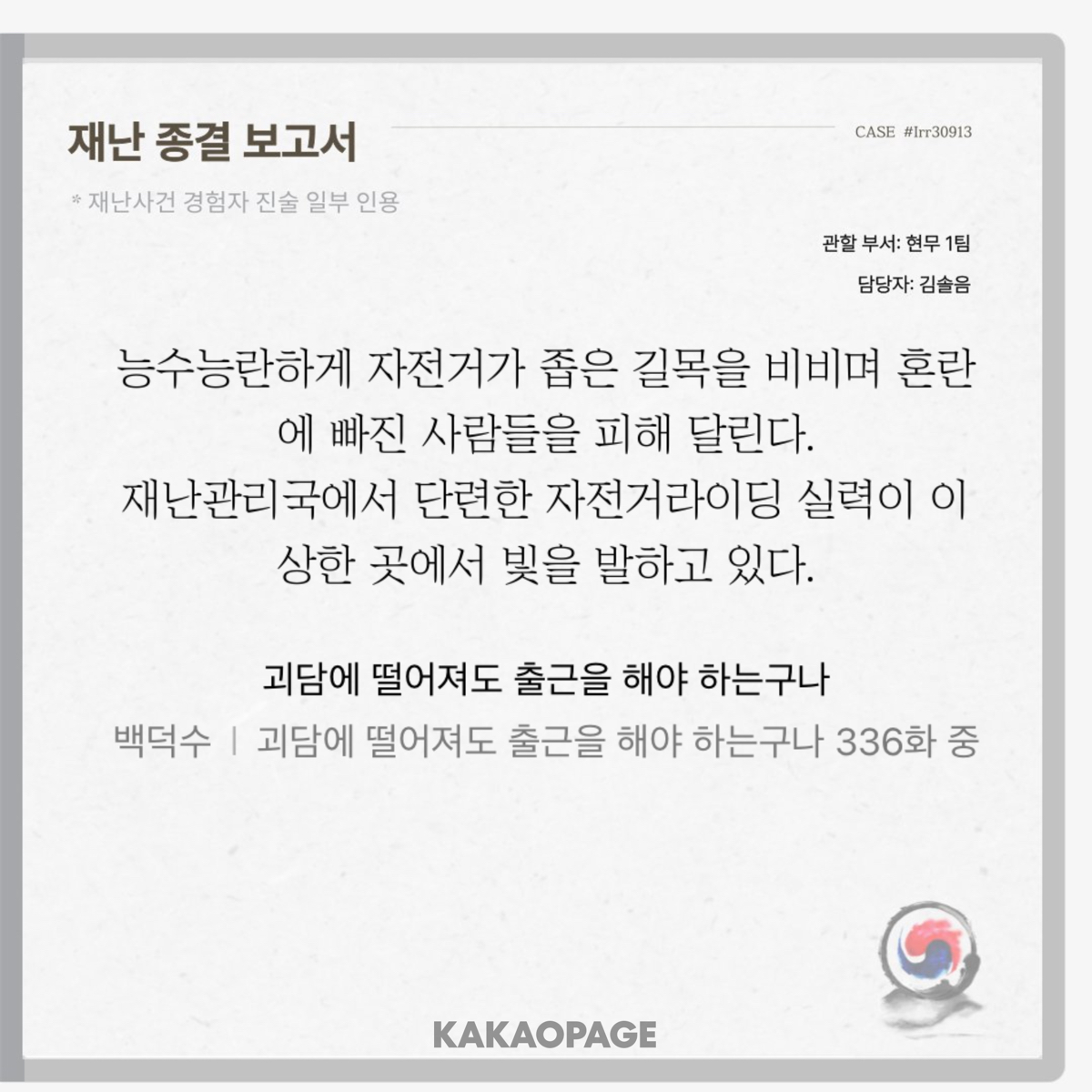 류재관이 4~5년 전에 고등학생이었는데 지금 베테랑 취급하는 게 말이 되나? 현장직인 거 고려해도 진지하게 저연차를 베테랑 취급하는 직군을 본 적이 없어 재난관리국을 당장 전쟁 중인 최전방 군인 취급하면 실제 과거라고 해도 억지로 개연성 구겨 넣을 수 있긴 해